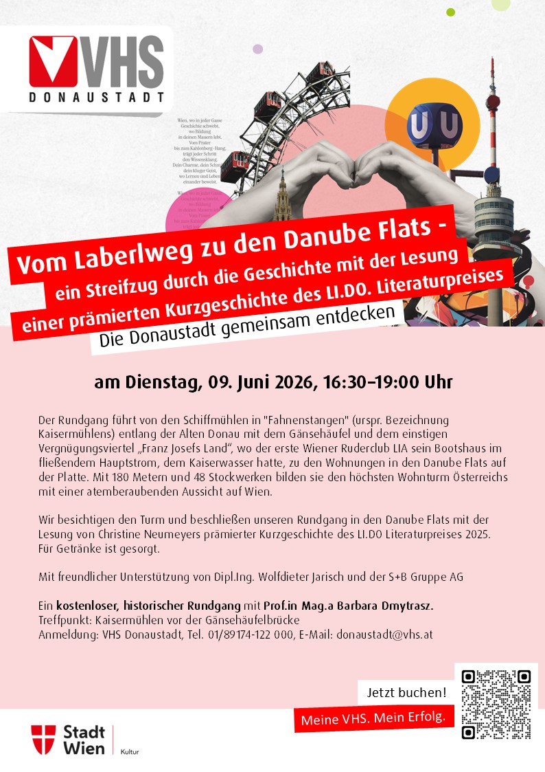 Der Rundgang verbindet Stadtgeschichte mit Gegenwart und führt vorbei am Gänsehäufel, dem ehemaligen Vergnügungsviertel „Franz Josefs Land“ und dem Kaiserwasser bis zu einem der markantesten Bauwerke Wiens.